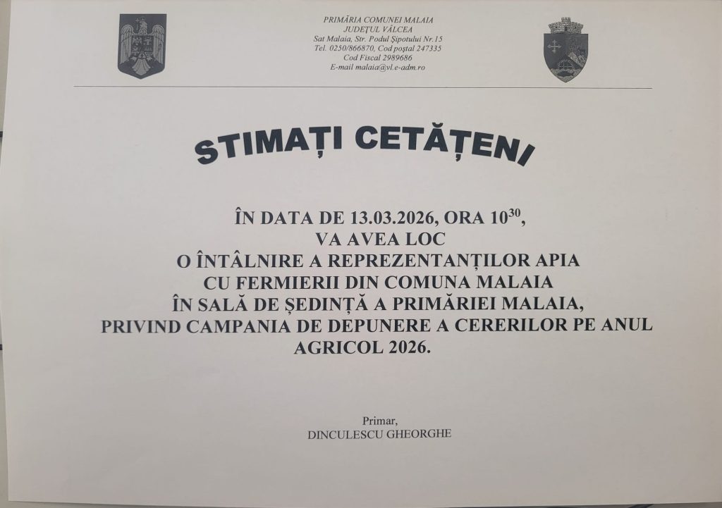 Anunt intalnire a reprezentantilor APIA cu fermierii din Comuna Malaia privind campania de depunere a cererilor pe anul agricol 2026